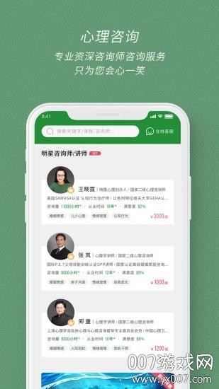 专业心理支持:由资深心理咨询师团队提供科学有效的心理干预方案,帮助用户缓解压力,重建健康心理状态。