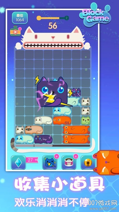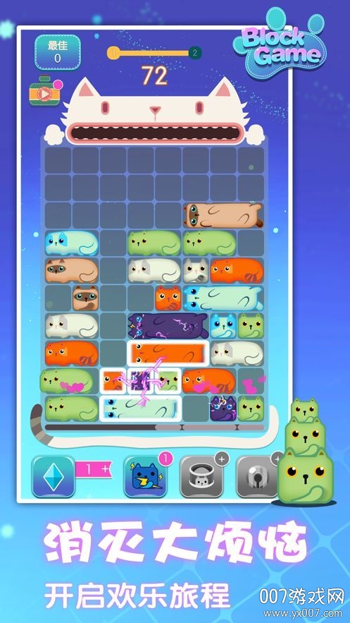 方块的消除过程采用生动可爱的动画效果,玩家需要通过消除不同颜色的方块来解锁新关卡,每个方块都有独特的表情;
