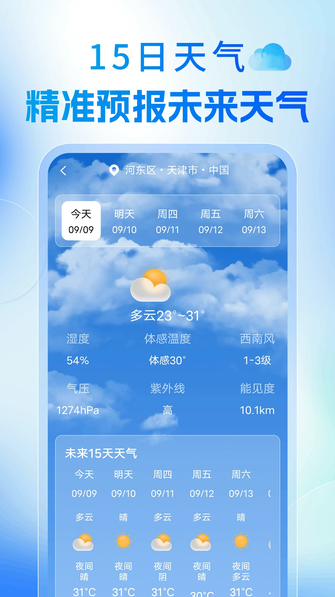 15日天气精准预报:提供未来两周的晴雨、云量、风向风速、空气质量等详细数据,帮助用户提前规划出行。