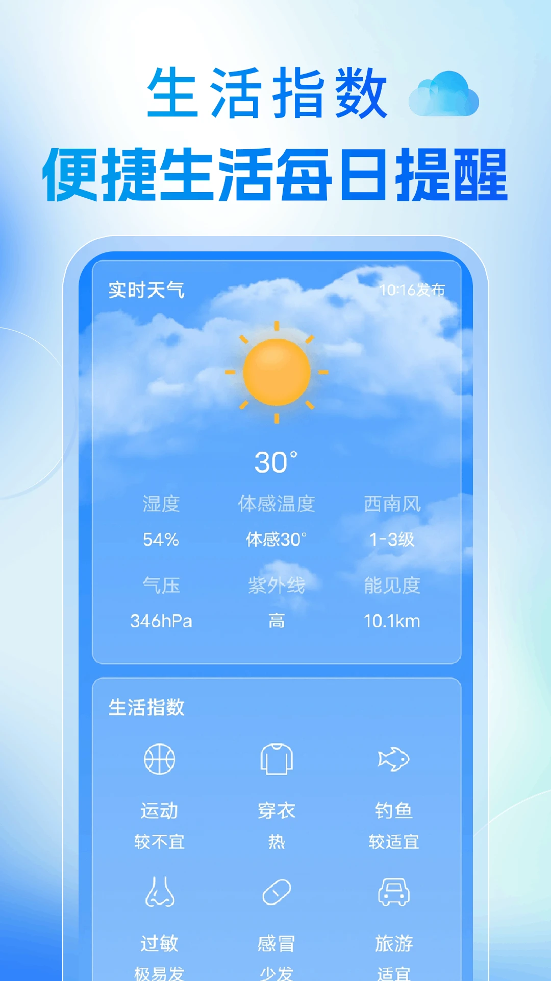 生活指数,贴心关怀根据天气、温度、风力,智能推荐穿衣搭配,让您风度与温度并存。分析气压、温度、风速,告诉您鱼儿是否活跃,助您满载而归。为易过敏人群提供贴心防护建议。根据温差、湿度变化,预测感冒风险,提醒您及时调整衣物,远离感冒困扰。