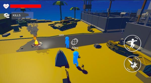 进入游戏后,玩家首先需要在【Pickanicename】界面输入个性化的游戏昵称,然后点击醒目的【JOINROOM】按钮即可加入游戏房间,这是开启精彩对战的第一步。游戏采用直观的触控操作,玩家可以轻松操控蓝色角色在城市中自由移动。屏幕右侧的闪电图标是射击按钮,点击即可向敌人发起攻击,同时要时刻关注左上角的生命值(红心图标)和击杀数(KILLS)统计,这些都是判断战况的重要指标。