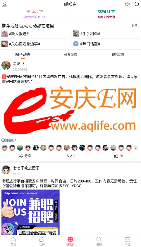 【每日热点】栏目实时更新当地重要信息,确保用户不错过任何城市热点。【便民服务】提供路线导航、常用电话查询、车辆违章查询等实用功能,让生活更便捷。【热门版块】聚集了大量活跃用户,讨论话题涵盖情感、房产、美食、民生等各个方面。【精彩分享】功能让用户能够结识志同道合的朋友,拓展社交圈,丰富日常生活。