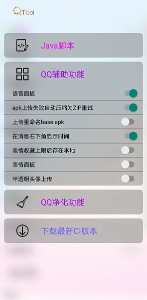 java脚本加载功能允许用户运行自定义脚本,实现更多个性化操作。语音面板和表情包面板则让聊天更加生动有趣。qq辅助功能包括消息右下角显示时间、base.apk上传重命名、apk上传失败自动压缩重试、半透明头像上传等,大大提升了使用便利性。qq净化功能则可以精简表情面板图标、隐藏聊天界面相机图标、隐藏打卡提示,让界面更加简洁清爽。