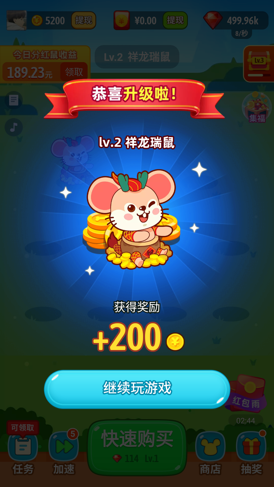 在鼠钱休闲版中,赚钱的方式多种多样。首先,玩家需要培养大量老鼠,通过不断合成让它们成长进化。其次,获得更高等级的老鼠后,可以完成更多任务挑战,赢取丰厚奖励。最重要的是,游戏还设置了突破关卡功能,让玩家在享受游戏乐趣的同时,还能赚取可观的零花钱。这种边玩边赚的模式,让赚钱过程变得轻松又有趣。