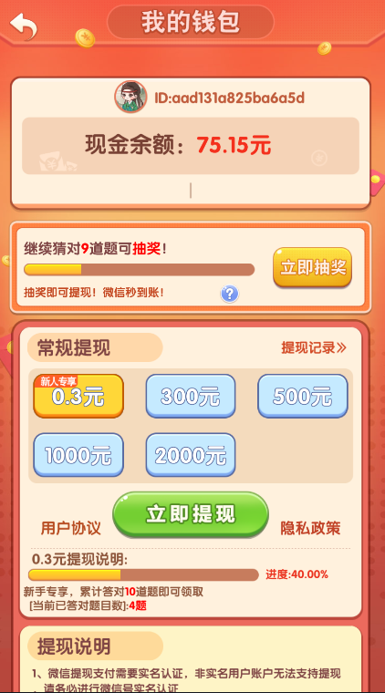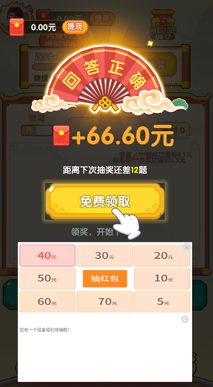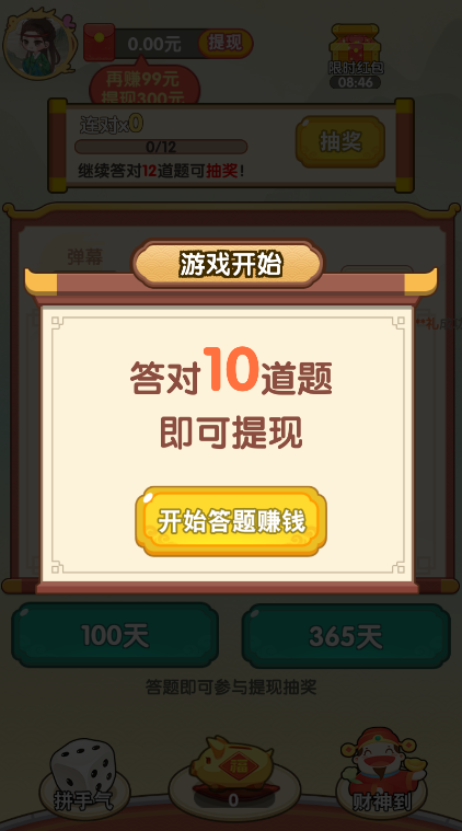 游戏采用极简设计理念,三步即可开始答题赚钱,无需复杂操作。每日更新精选题目,紧跟时事热点,让知识储备与时俱进。科学的题目分类系统,帮助玩家有针对性地提升知识短板。贴心的错题本功能自动记录答错题目,方便复习巩固。独特的社交系统支持好友PK,在互动中共同进步。多档位提现选择满足不同需求,从0.3元小额到百元大额均可快速到账。