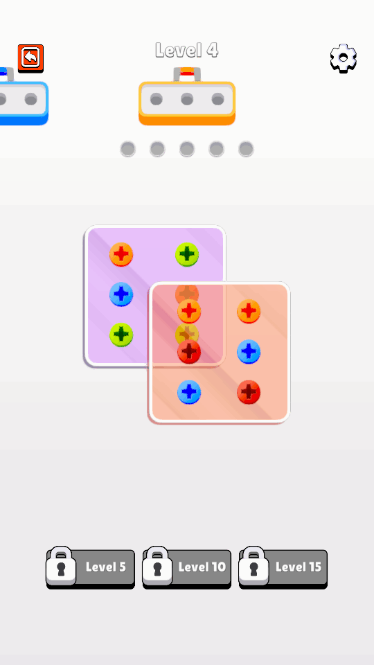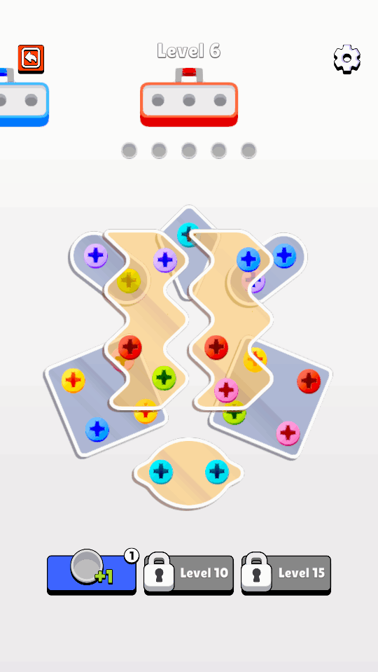 游戏采用循序渐进的设计理念,初期关卡较为简单,玩家只需要将相同颜色的螺丝拧到对应颜色的位置即可。随着关卡的推进,游戏难度会逐渐增加,最多会有5个位置可以放置其他颜色的螺丝,这需要玩家更加仔细地规划操作顺序。在后期关卡中,玩家需要先观察整个关卡的螺丝分布情况,制定合理的操作策略,才能顺利完成挑战。游戏还设置了多种特殊道具和障碍物,为玩家带来更多趣味性和挑战性。