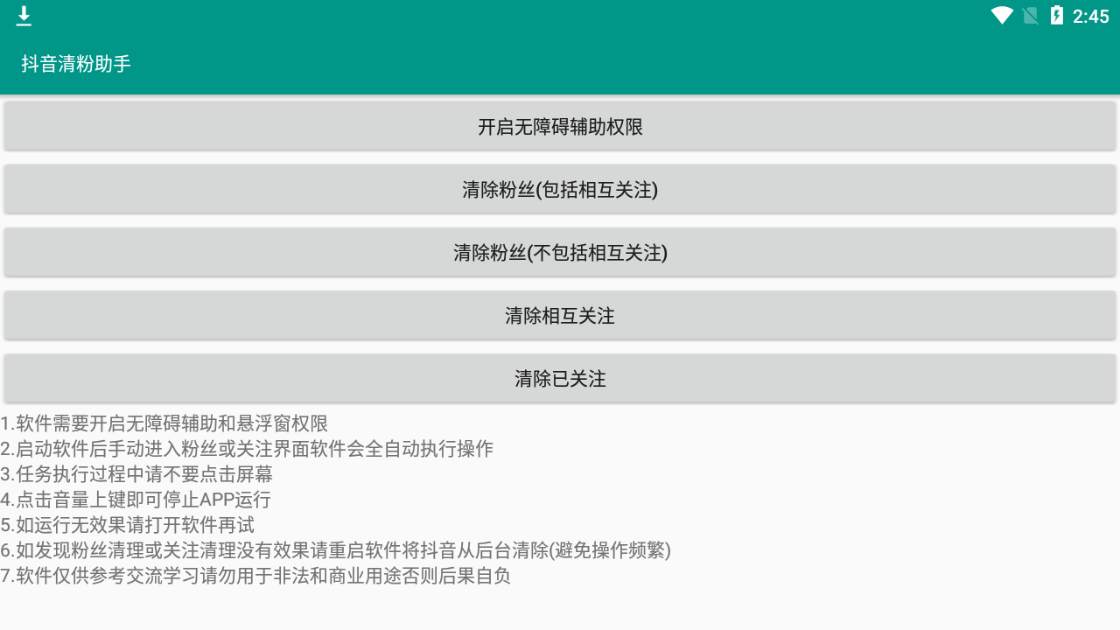 软件需要获得打开无障碍协助和暂停窗口的许可,确保操作流畅无阻。启动软件后,手动进入风扇或注意界面,软件将自动执行操作,无需复杂设置。执行时请不要屏幕,以免影响清理进程。单击“音量增大”按钮可随时停止程序操作,灵活控制清理节奏。如果操作无效,请打开软件再试一次,确保功能正常运行。抖音清洁或清洁无效时,建议重新启动软件,并从后台关闭抖音应用,避免频繁操作导致的问题。本软件仅供交流和学习使用,请勿用于非法或商业用途,否则后果自负。