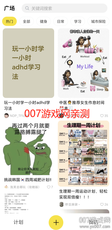 接着进入到广场中可以看到许多的帖子,这里汇聚了各类用户分享的实用计划模板,包括学习、健身、旅行等多种场景,满足不同需求。