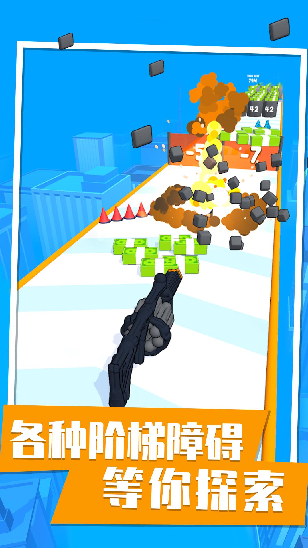 游戏过程欢快刺激,左右移动收集钞票和火柴人来增强你的实力,打破所有的阻挡。背景音乐动感十足,配合射击音效,营造出完美的游戏氛围。