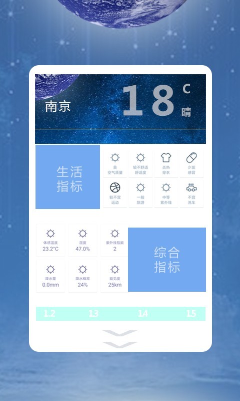 实时天气,各项天气信息,随手掌握,让您随时随地了解当前天气状况,包括温度、湿度、风力等详细数据;每日预报,精准预测未来一周,提供最高最低温度、降水概率等关键信息,帮助您提前规划行程;生活指南,丰富全面,您的出行管家,涵盖紫外线指数、穿衣建议、运动适宜度等实用内容,让生活更加便捷舒适。
