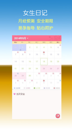 月经期、预测期、安全期、易孕期、排卵期轻松标记,给你带来贴心呵护。提供健康建议和数据分析,帮助女性更好地管理生理周期。