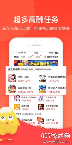 海量热门手机游戏,只要试玩到指定阶段即可获得体验金,海量低门槛、易上手的任务等你体验,不容错过的赚钱选择。蛋咖app每周都会更新游戏库,确保用户始终有新鲜的游戏可以体验赚钱。