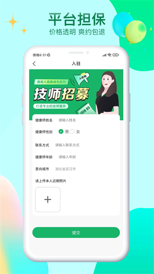 平台覆盖资源广泛,技术人员资源丰富,技术人员实名认证、资质认证,建立了完善的信用评价体系;通过海量优质技术人员的连接,为用户提供高质量、高标准的居家按摩,服务范围覆盖全国主要城市;集合了数万种优质家居服务,提供高级认证技术人员和专业服务,满足从基础保健到专业理疗的各种需求。平台还与多家保险公司合作,为每单服务提供安全保障。