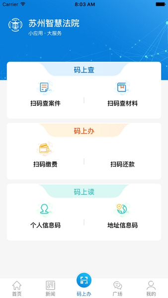 马上办:扫码查案件、扫码查材料、扫码缴费、扫码还款、个人信息码、地址信息码等,创新扫码服务模式