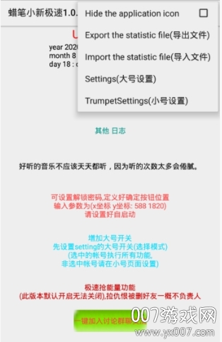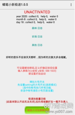 可设置解锁密码定义好确定按钮位置,确保操作安全便捷。输入参数为(x坐标y坐标:5881820),精准定位功能按钮。请设置好自启动,以便软件在后台持续运行。增加大号开关功能,方便用户切换不同账号模式。先设置setting的大号开关(选择模式),灵活管理账号任务。(选中的帐号执行所有功能非选中帐号请在小号页面设置),满足多账号用户需求。极速抢能量功能,提升能量收取效率。此版本默认开启无法关闭)拉仇恨被删好友一概不负责人,请谨慎使用避免影响社交关系。