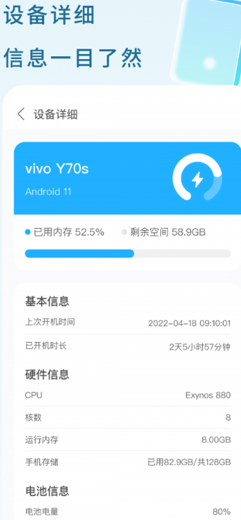 电池信息,为用户详细展示手机电池信息,例如电量、温度、电压等信息,让用户对电池状况了如指掌。耗电管理,耗电情况,及时提醒用户耗电量异常的应用程序,释放内存和CPU,有效提升手机运行效率。随时可以查看手机电池温度,电池电压,优化电池状态,保护手机电池健康、延长电池使用时长,智能调节充电模式确保安全充电。
