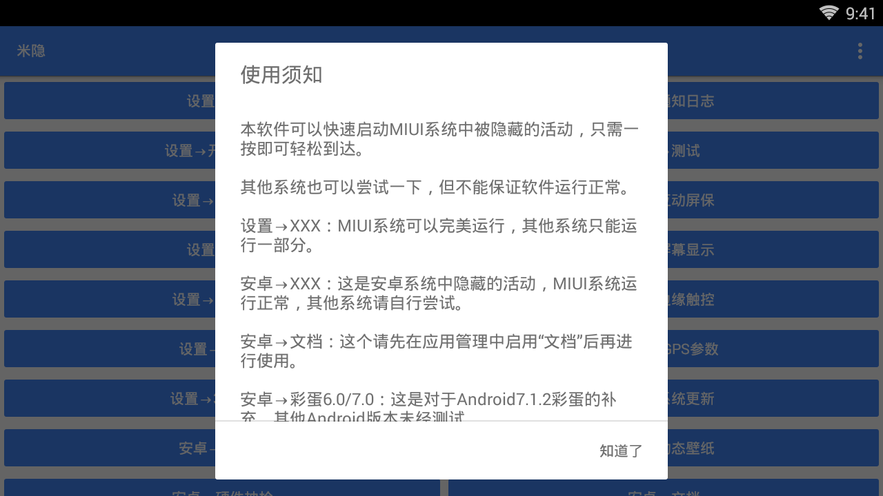 米隐主要针对MIUI系统用户设计,可以快速访问系统隐藏的功能设置。使用前请确保你的手机支持相关功能,不过很多功能在其他安卓系统中同样适用。软件界面简洁直观,所有功能都经过精心分类,查找和使用都非常方便。无论是想要优化系统性能,还是探索手机中的有趣彩蛋,米隐都能满足你的需求。软件操作简单,无需专业知识,只需点击相应按钮即可完成设置。建议新用户先浏览功能说明,以便更好地了解各个模块的作用。
