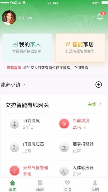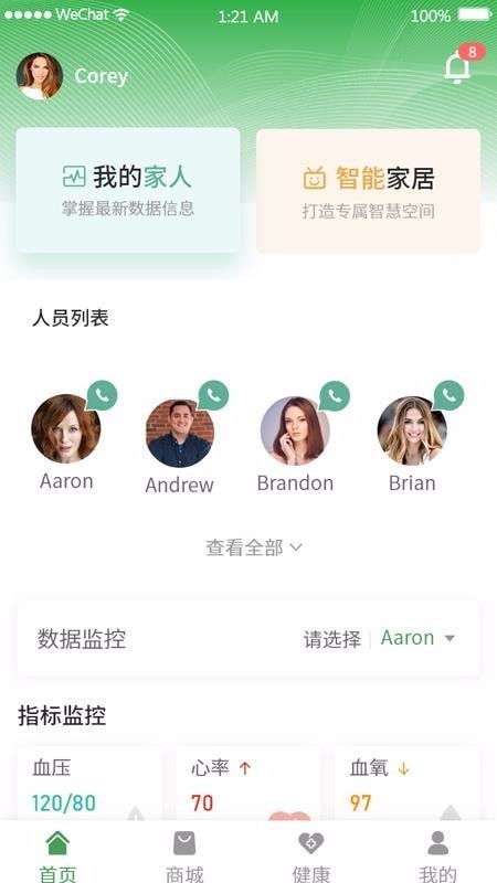 切换家人健康数据功能让您轻松掌握家人的身体状况。只需在首页的"我的家人"栏目中选择需要监控的成员,即可查看其健康数据,让关爱无处不在。添加新智能设备也非常简单,通过智能家居模块中的添加功能,您可以快速将新设备接入系统,扩展您的智能家居网络。