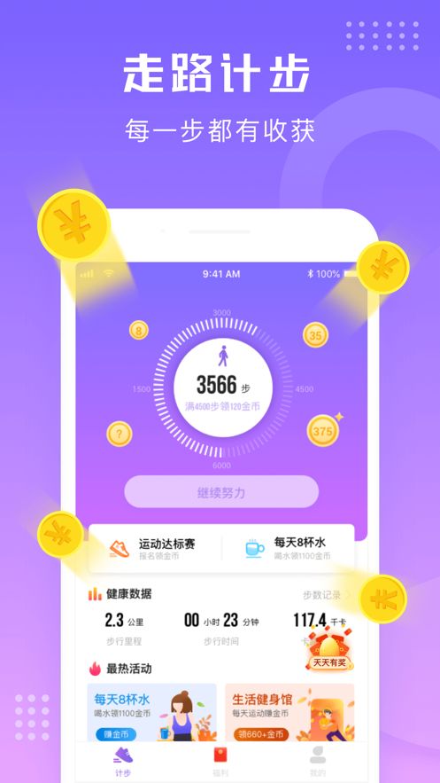 走路宝app采用高精度计步算法,能够准确记录用户每一步行走数据,是您贴身的智能计步专家。创新的步数兑换金币机制让运动变得更有动力,行走越多收获越大。每日签到系统配合成就体系,让坚持运动变得充满乐趣,帮助您逐步提升运动量,养成健康生活方式。