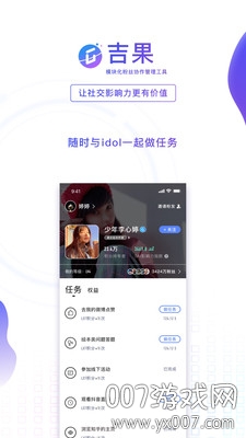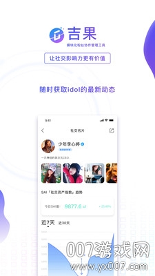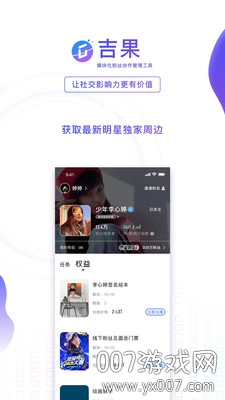 吉果粉丝运营助手版是一款专为追星族打造的创新应用,让粉丝们能够随时随地支持自己的偶像。在这里,你可以参与各种应援活动,与爱豆零距离互动,感受前所未有的追星乐趣。平台汇聚了海量明星资源,提供最新、最热、最全的娱乐资讯,满足粉丝们的多样化需求。无论是获取独家内容,还是参与粉丝互动,吉果粉丝运营助手版都能让你的追星体验更加丰富多彩,同时助力粉丝运营更加高效便捷。