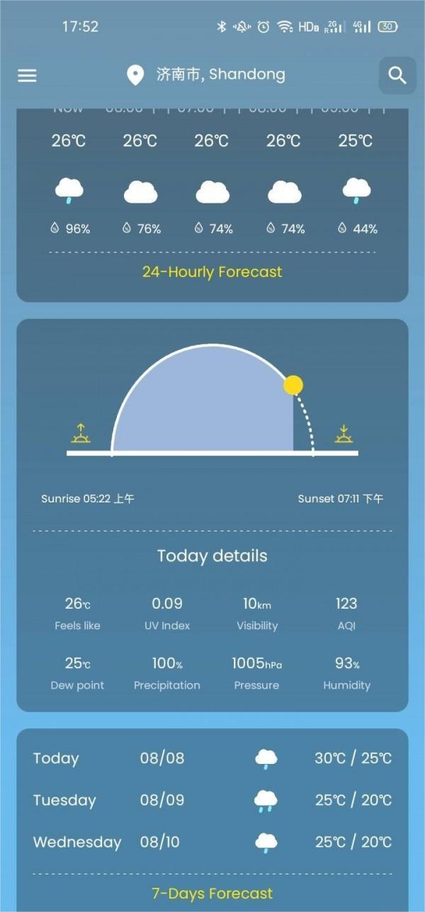 日常出行:上班族可以提前查看通勤时段的天气状况,决定是否需要携带雨具或增减衣物,避免因天气变化影响行程。旅游规划:旅行爱好者可以查询目的地未来一周的天气趋势,合理安排景点游览顺序,避开恶劣天气影响游玩体验。户外活动:登山、露营等户外运动爱好者可以获取精确到小时的山地气象数据,了解风速、气压变化,确保活动安全。决策:家庭主妇可以根据湿度预报决定洗衣晾晒时间,或根据空气质量指数选择开窗通风的最佳时段。预警提醒:在台风、暴雨等极端天气来临前,系统会提前推送红色预警,并附带防灾指南,帮助用户做好应急准备。