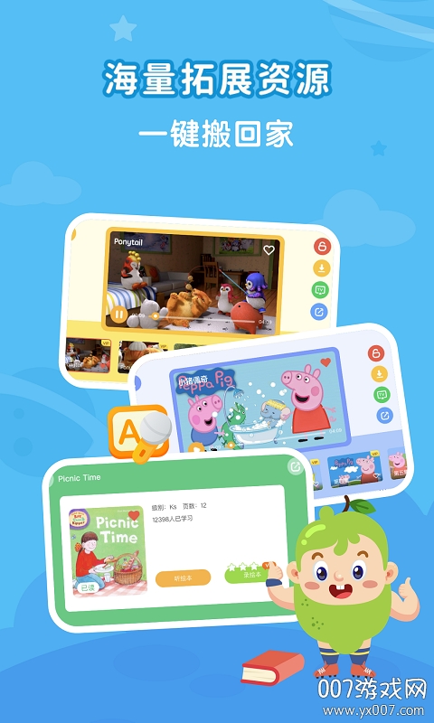 海量的优质学习资源,提升英语学习兴趣的同时,让孩子们在轻松愉悦的氛围中,实现3万个小时英语环境的浸泡目标。平台还特别设计了"英语角"功能,让孩子们可以和其他小朋友进行英语交流,培养实际应用能力。