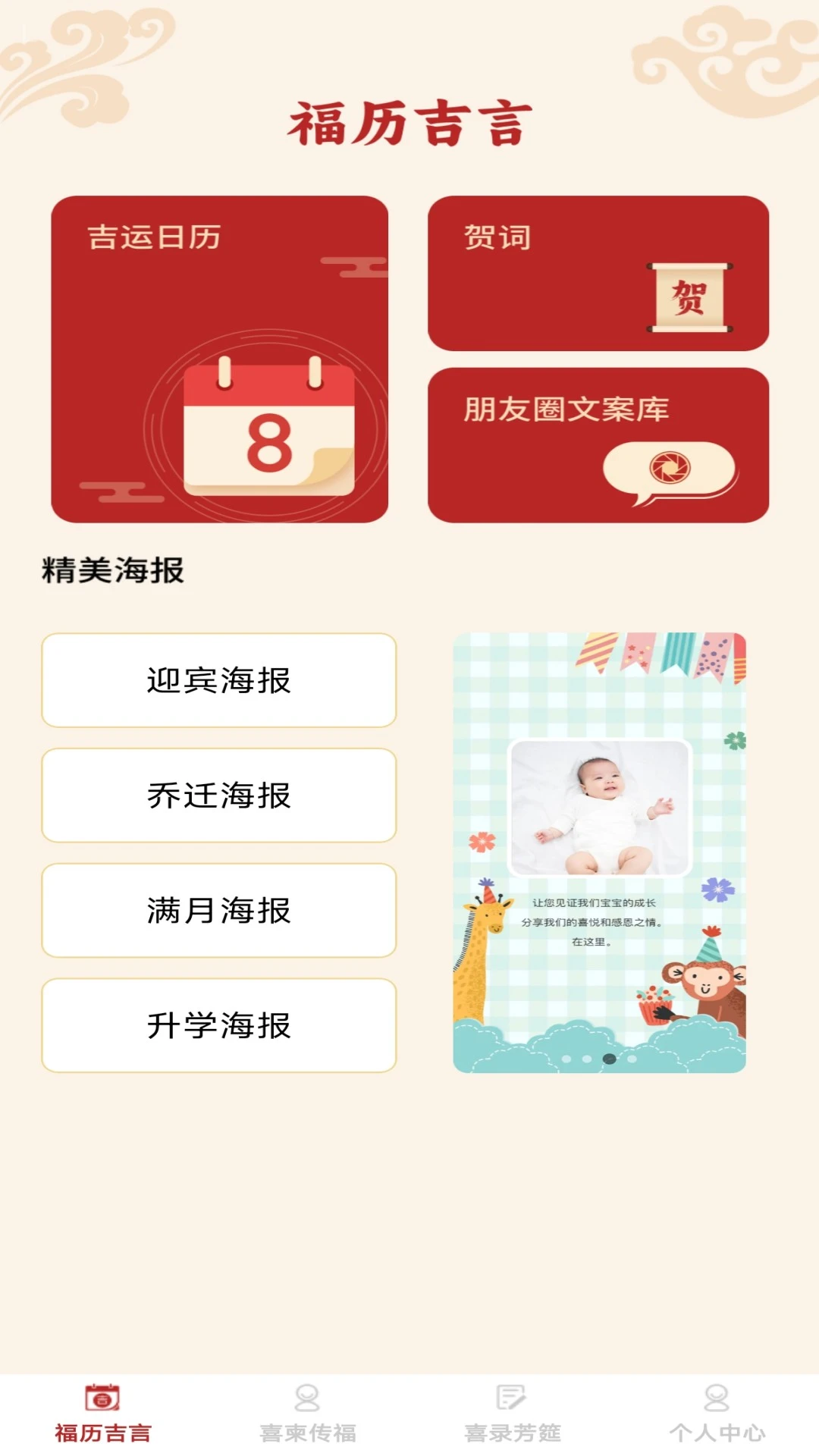 福喜同乐为您提供吉日查询、贺词与朋友圈文案库、多场景海报制作及活动管理功能。涵盖婚礼、乔迁、满月等喜庆场景,可生成迎宾海报与邀请文案,查看传统黄历宜忌,协助您轻松筹备各类吉庆活动,传递美好祝福。