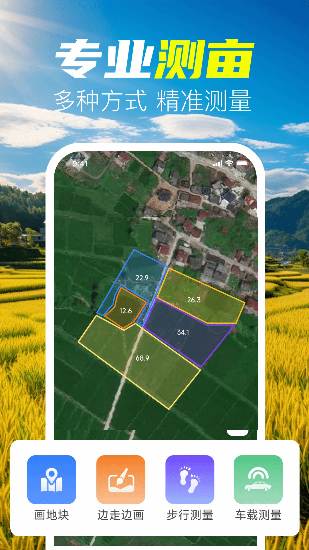 -多场景测量方式:支持画地块、边走边画、步行测量、车载测量,小地块精细画、大地块移动测,适配农田、林地等不同场景;