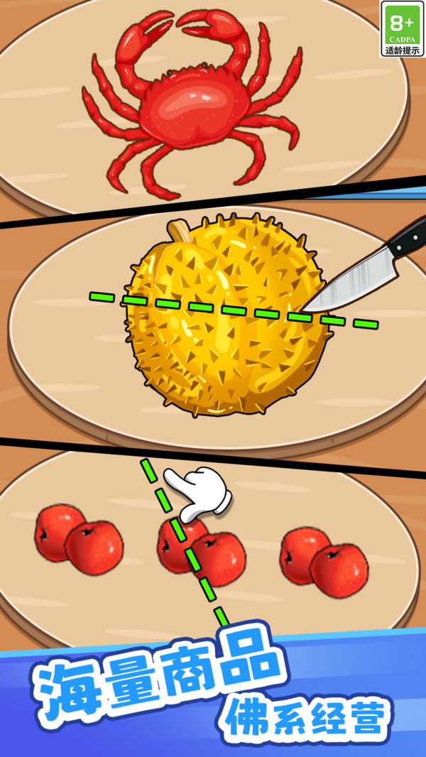 游戏以各类常见食物作为切割对象,主题鲜明且贴近日常生活。场景设计细致入微,从食材纹理到刀具反光都力求真实,让玩家仿佛置身于真实的厨房环境中。不同食材的切割手感差异明显,增加了游戏的可玩性。