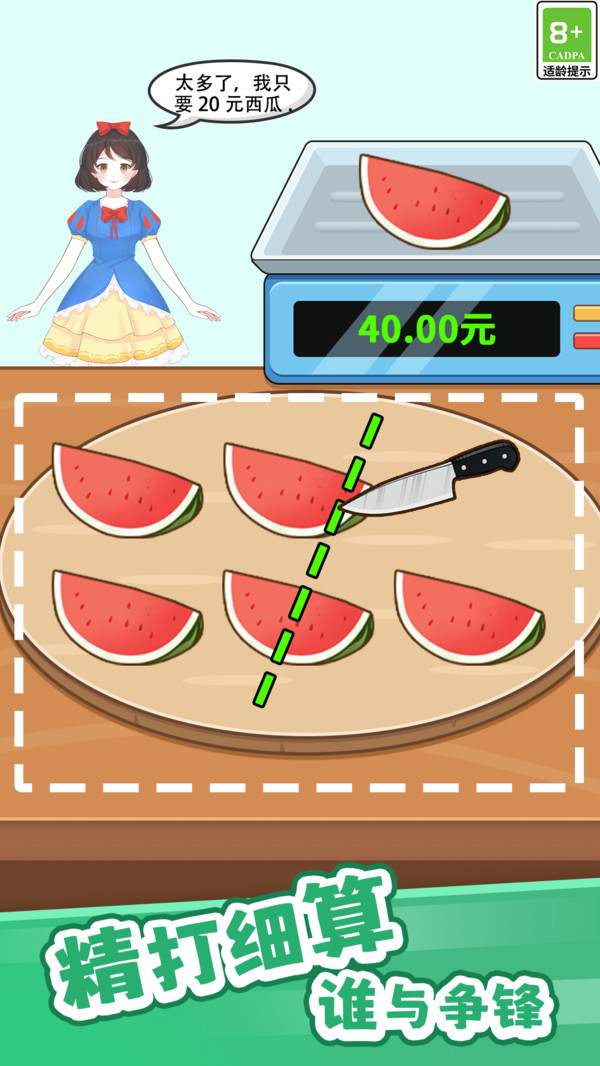 当秤显示达到【9.00斤】时,使用界面提供的各种刀具工具继续处理食材。面对曹老板的特殊要求时,需要灵活运用游戏技巧,合理选择切割方式才能顺利通关。每个关卡都设有多个评分标准,完美通关可获得额外奖励。