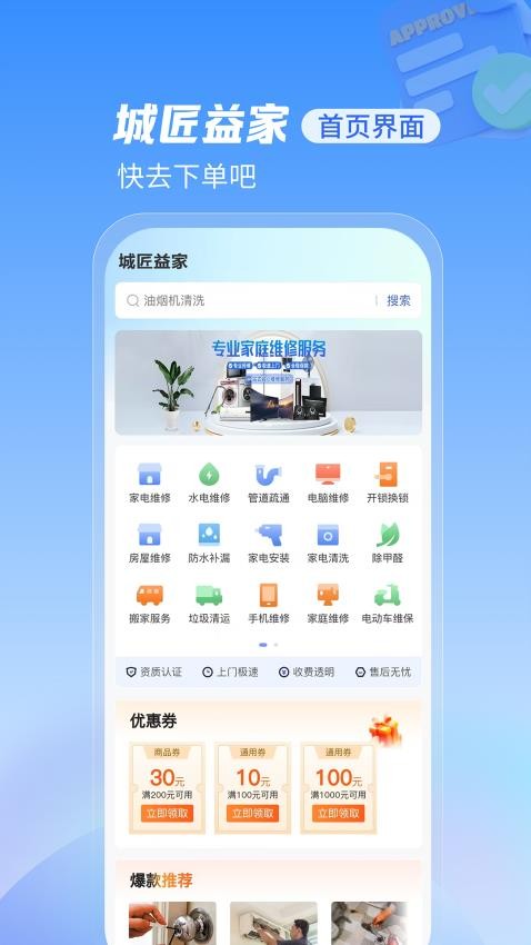 城匠益家app客户端是一款专业且便捷的上门维修服务预约平台,致力于为用户提供高效、优质的家居维修解决方案。这款软件整合了全国各地的专业维修团队,涵盖家电维修、水电维修、房屋维修等全方位服务项目,让您足不出户就能解决各类家居问题。通过简洁直观的界面设计,用户可以轻松浏览各类服务,快速下单预约,享受专业师傅上门服务。无论是突发故障还是日常维护,城匠益家都能为您提供及时可靠的解决方案。