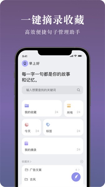 【更高效】独创的一键摘录功能,配合智能分类系统,让你的句子管理更加得心应手。