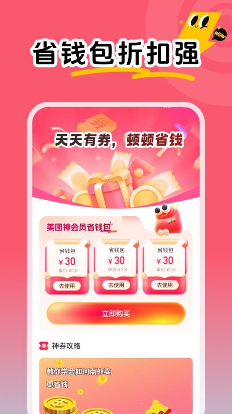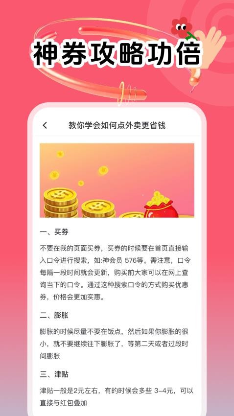 是你的外卖省钱好助手,从此以后用户可以享受到更多的省钱优惠福利了。除了提供优惠券,app还会教你如何合理搭配使用优惠券,比如在特定时间下单可以叠加使用多张优惠券。
