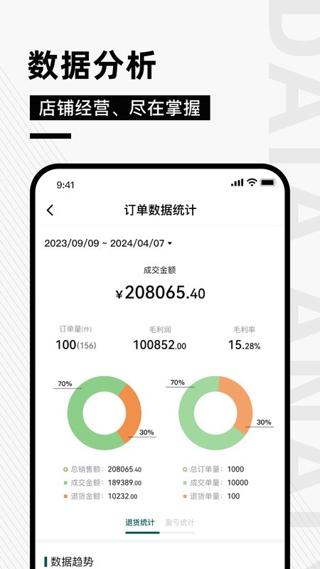 多维度的数据统计功能,包括销售分析、库存周转、客户画像等,让店铺经营状况尽在掌握。
