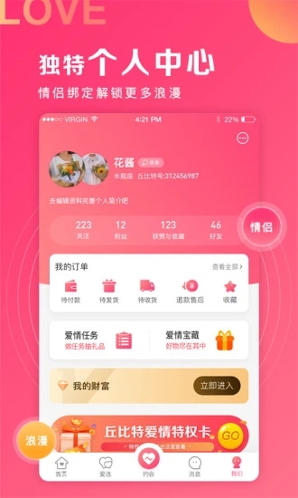 丘比特爱情app是当代年轻人社交和消费的新选择。在这里,您不仅能结识志同道合的朋友,还能发现各种有趣且性价比高的商品和服务,享受令人愉悦的消费体验。平台集多种功能于一体,包括个性化定制、热门话题社区、互动直播、AR虚拟体验、趣味红包抢夺以及收益分享等创新玩法。无论是都市白领、在校学生,还是已婚人士,都能在这里找到适合自己的社交方式。我们致力于帮助用户解决约会难题、送礼困扰以及恋爱维系问题,让您的爱情生活更加甜蜜美好!