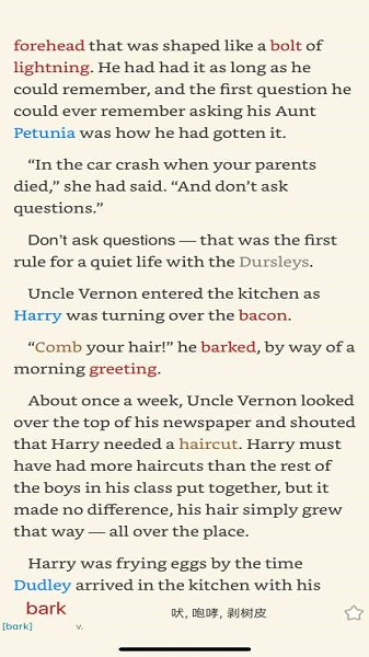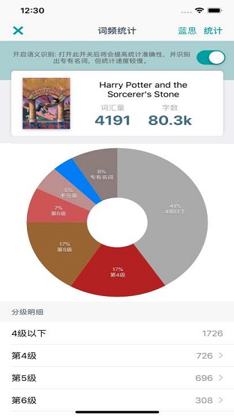 分类词频标注功能支持大学四六级、GRE、托福、雅思、专四专八、考研等各类考试词汇,方便针对性学习。自动检索功能能智能识别高难度词汇,并将释义显示在侧边栏或底边栏,查看非常方便。词频统计功能可以分析一本书中的词汇分布和总量,帮助评估阅读难度。基于Collins权威词频的分级系统,用不同颜色标记不同难度词汇,让重点词汇一目了然。
