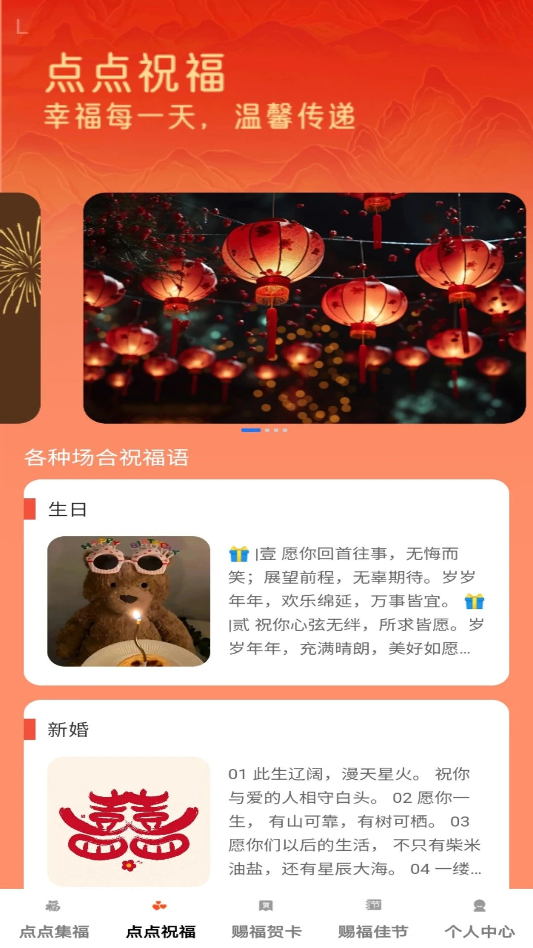 点点祝福:提供海量祝福语库,涵盖生日、节日、婚礼等多种场景,一键复制即可使用。
