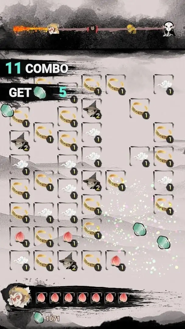 视觉享受性:游戏采用纯手绘水墨风格,每一帧画面都如同流动的国画,角色动作细腻流畅,场景细节丰富考究,搭配悠扬的古风配乐,营造出极具东方美学的沉浸式体验。玩法融合性:突破传统消除游戏框架,将三消玩法与RPG战斗系统完美结合,每个消除操作都可能触发强力技能,需要玩家根据战场形势灵活调整策略。进度可见性:随着关卡推进,玩家将解锁新角色和强力技能,清晰的成长系统让每次进步都直观可见。技能应用方法:针对不同敌人类型,需要合理搭配群体攻击、单体爆发和治疗技能,形成最优战斗组合。