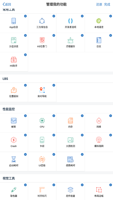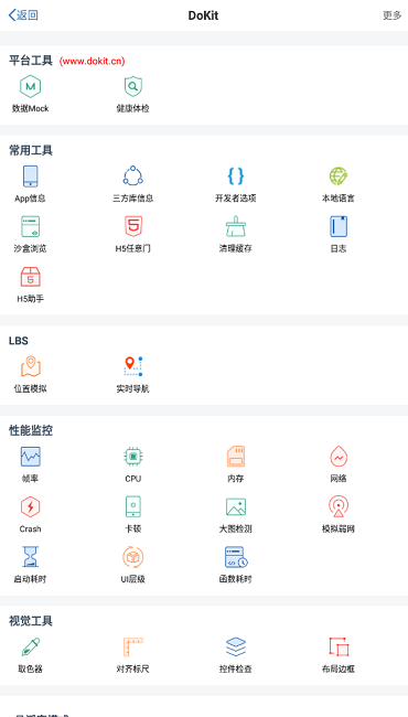 功能全面性:从基础的App信息查询到高级的性能检测和视觉调试工具,DoKit集成了数十种实用功能模块,满足开发者在不同阶段的各种需求。