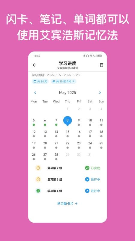 结合艾宾浩斯遗忘曲线,自动生成每日复习计划,助你巩固所学,事半功倍。系统会智能分析用户的记忆薄弱点,优先推送易错内容,避免无效重复。通过科学的间隔重复算法,确保知识长期留存。