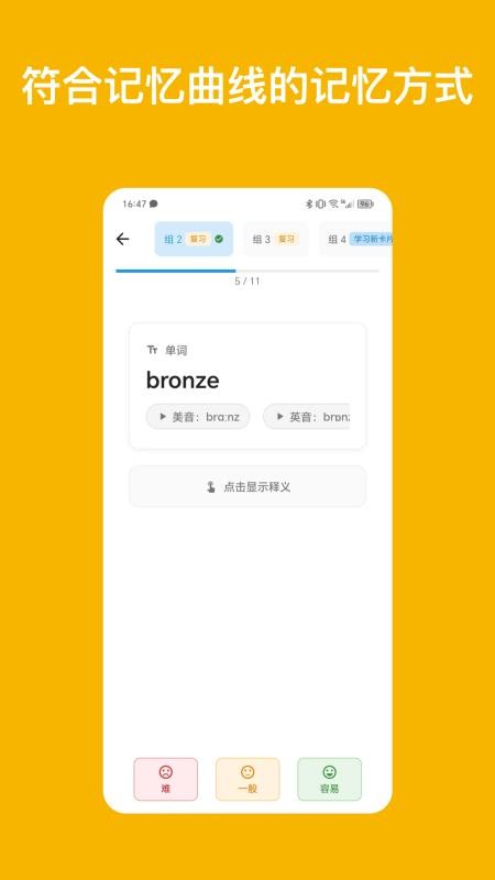 专门的背单词模块,支持导入单词表,结合闪卡模式,按遗忘曲线推送复习,提升单词记忆效率。内置多种单词测试模式,包括拼写、选择、填空等。支持单词发音对比练习,纠正发音问题。