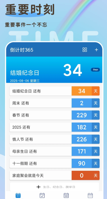 倒计时365app是一款功能强大且实用的时间管理工具,专为帮助用户记录和追踪生活中的重要时刻而设计。无论是倒计时日、纪念日、生日还是其他特殊日子,这款应用都能轻松满足您的需求。通过直观友好的界面和丰富的功能设置,倒计时365app让每一天的等待都变得充满期待和动力。