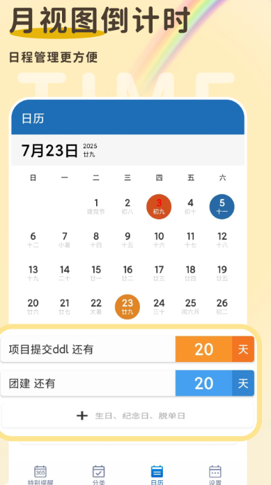 倒计时365app提供了多样化的主题样式,用户可以根据个人喜好自由切换,打造个性化的倒计时界面。无论是公历还是农历日期,这款应用都能完美支持,满足不同用户的文化习惯。此外,您还可以自定义倒计时背景,让每一次查看都充满独特风格。通过简单的操作,您可以快速添加多个倒计时事件,并一键导入数据,省时省力。
