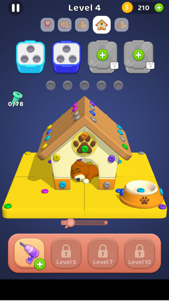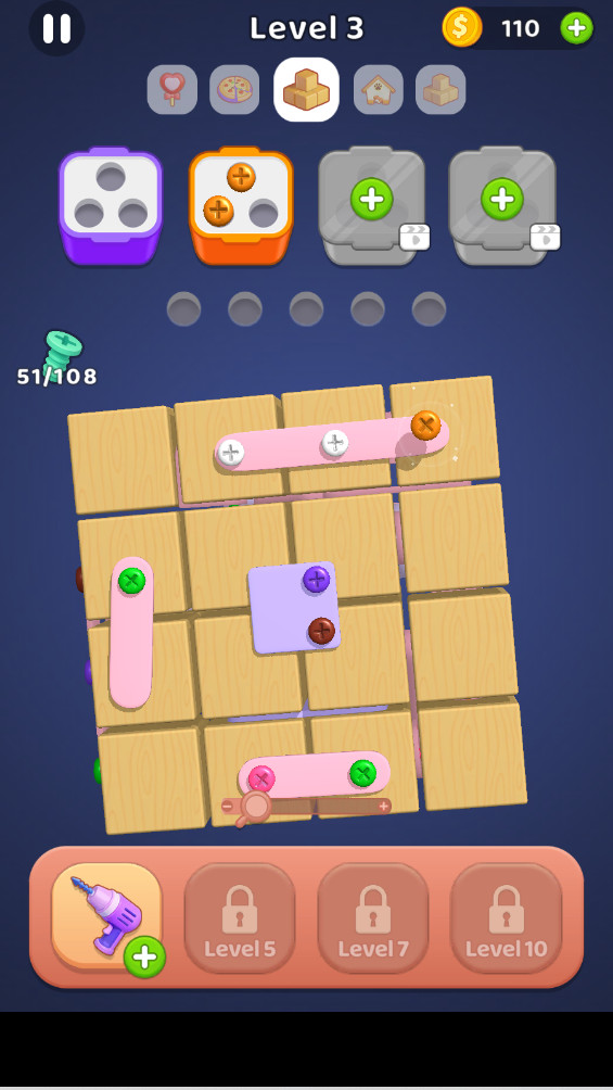 游戏的操作方式简单直观,玩家只需点击螺丝即可完成操作。如果暂时无法匹配螺丝,玩家可以将它们放置在屏幕下方的备用栏中。一旦出现相关颜色的螺丝,系统会自动将它们放置到合适的位置,帮助玩家顺利完成关卡。