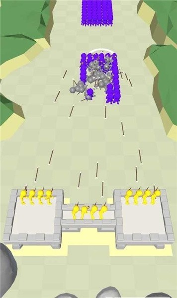 当遇到紫色敌人时,需要指挥黄色小人的箭塔释放箭雨攻击。白色圆圈代表弓箭的攻击范围,将白圈精准移动到敌人队伍中间可以最大化杀伤效果,这需要玩家具备一定的预判能力。