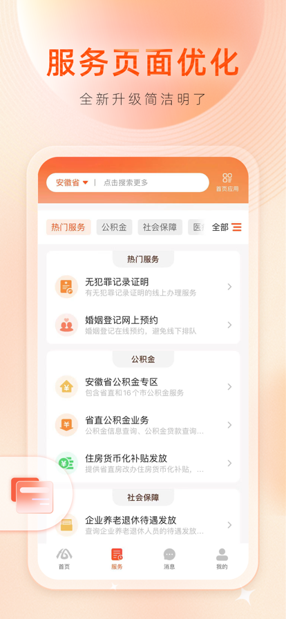 皖事通APP作为安徽省政务服务数字化转型的重要成果,持续优化功能体验,拓展服务场景。目前平台已集成户政服务、出入境办理、婚姻登记、职业资格认证、医疗保障、公积金查询、电子证照等20余类民生服务,覆盖全省16个地市。通过智能化的服务流程和人性化的交互设计,皖事通让政务服务变得触手可及,真正实现了"让数据多跑路,让群众少跑腿"的服务理念。