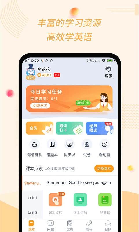 与学校同步的电子化教材以及配套的词汇和句子练习,贯穿课前预习、课堂学习、课后复习、交流分享的各个阶段,帮助学生真正掌握所学知识,养成良好的学习习惯;