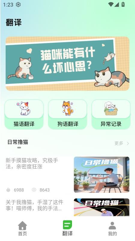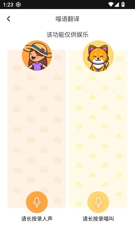 如此用户分别长按人声录制和猫叫录制后,就可以进行翻译了,系统支持实时翻译和录音回放两种模式,满足不同场景需求。