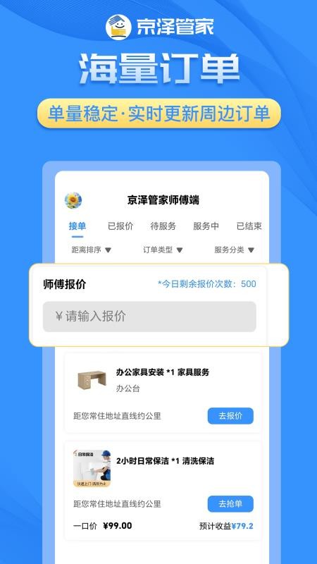 京泽师傅端app是一款专为各类技术师傅打造的智能接单服务平台,致力于为师傅们提供高效便捷的线上接单体验。作为专业的接单工具,该软件整合了海量优质订单资源,通过智能算法实时推送,让师傅们能够快速找到最适合自己的订单。无论是家电维修、水电安装还是其他专业技能服务,都能在这里找到对应的订单机会,帮助师傅们实现收入最大化。