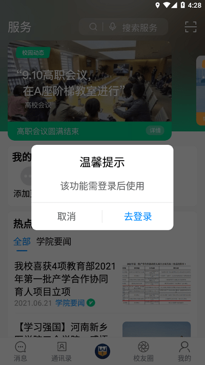 可以找到全校同学的校内通讯录,按院系、年级、学号查找,在线私信更方便。支持群组聊天功能,方便班级、社团等组织交流,同时提供消息提醒和已读回执功能,确保重要信息及时传达。